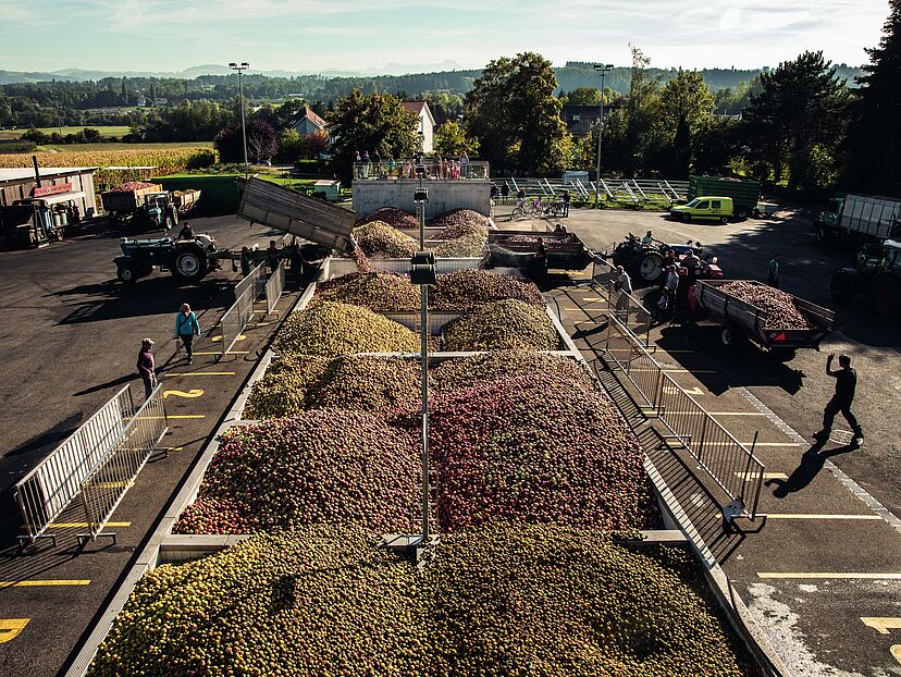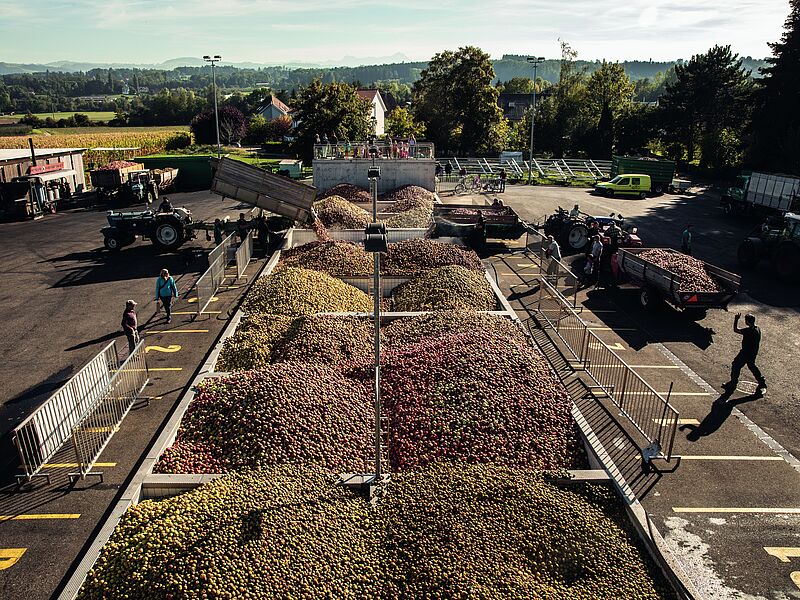 800 Bauernbetriebe liefern bei uns direkt an oder indirekt via lokale Sammelstellen. Die Bioannahme und Verarbeitung erfolgt jeweils an spezifischen Tagen, um die geforderte separierte Verarbeitung sicherzustellen. Speziell an der Bioverarbeitung ist, dass aufgrund der Anforderungen Bio Suisse/Knospe mit Direktsaft gearbeitet wird, also nicht via die Herstellung von Konzentraten und Rückverdünnung vor der Abfüllung.