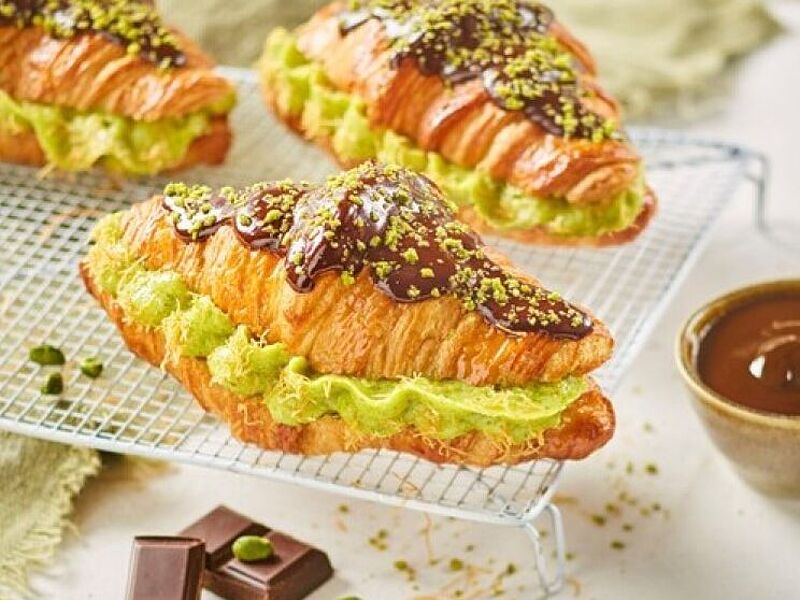 Kataifi-Teig in Butter goldbraun rösten. Pistazienpaste und Tahini verrühren, Mascarpone, Sahne und Puderzucker aufschlagen und den Kataifi unterheben. Croissant Éclat du Terroir längs aufschneiden, die Füllung aufdressieren, mit Kataifi garnieren, mit Zartbitterschokolade bestreichen und mit gehackten Pistazien verfeinern.