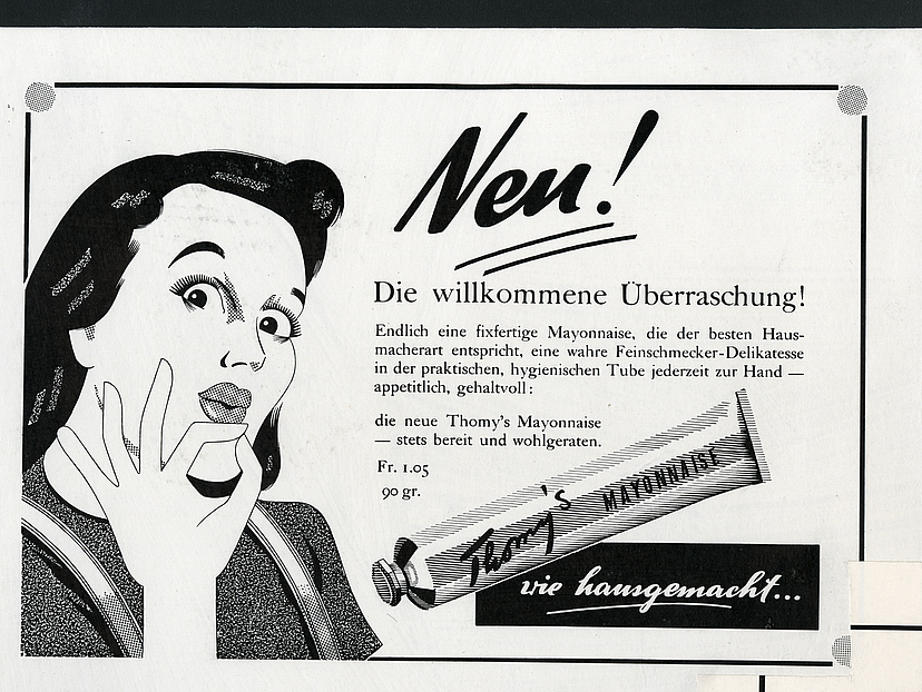 Mit der Einführung ihrer Mayonnaise à la Française im Jahr 1951 bringt Thomy die erste industriell produzierte Mayonnaise Europas auf den Markt. Diese Innovation basierte auf der Erfahrung mit der Thomy Senftube einer Weltneuheit von 1934 sowie auf technischem Know-how. So konnte eine hochwertige Mayonnaise aus natürlichen Zutaten hergestellt werden, die einer hausgemachten entspricht und dank ihres praktischen Formats lange ihren Geschmack bewahrt. Die Thomy Mayonnaise etabliert sich rasch als unverzichtbare Referenz und wird zur meistkonsumierten Mayonnaise der Schweiz. Seit ihrer Einführung wird sie in der Fabrik Basel hergestellt dem Ursprungsort der Marke und einem bedeutenden Nestlé‑Standort in der Schweiz, der auf Senf und Mayonnaise-Produktion spezialisiert ist. Rund hundert Mitarbeitende stellen hier jährlich durchschnittlich etwa 13’000 Tonnen verschiedener Thomy Produkte her.