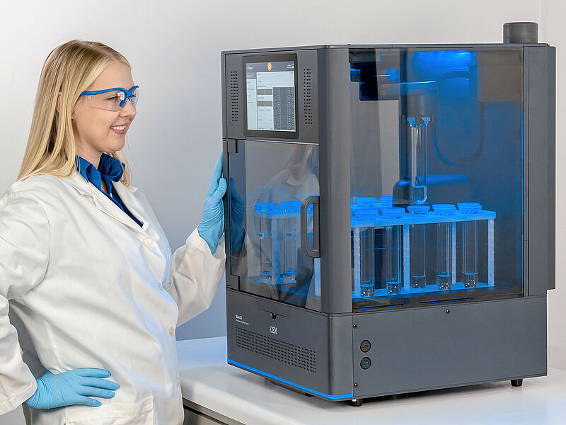 Der integrierte Autosampler des Blades erlaubt das unbeaufsichtigte Abarbeiten aller Proben auch über Nacht. Mit externen Roboterzugriffen können die Aufschlussgefäße zudem ins Blade bewegt werden sowie die Dosierung der Reagenzien erfolgen.