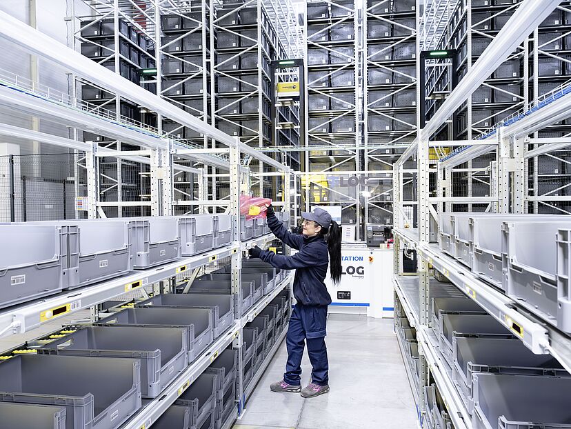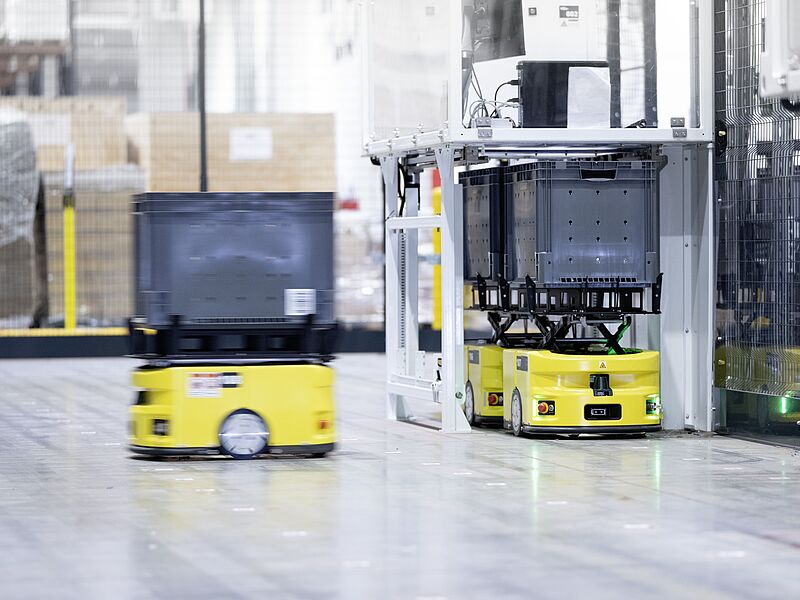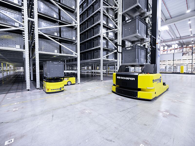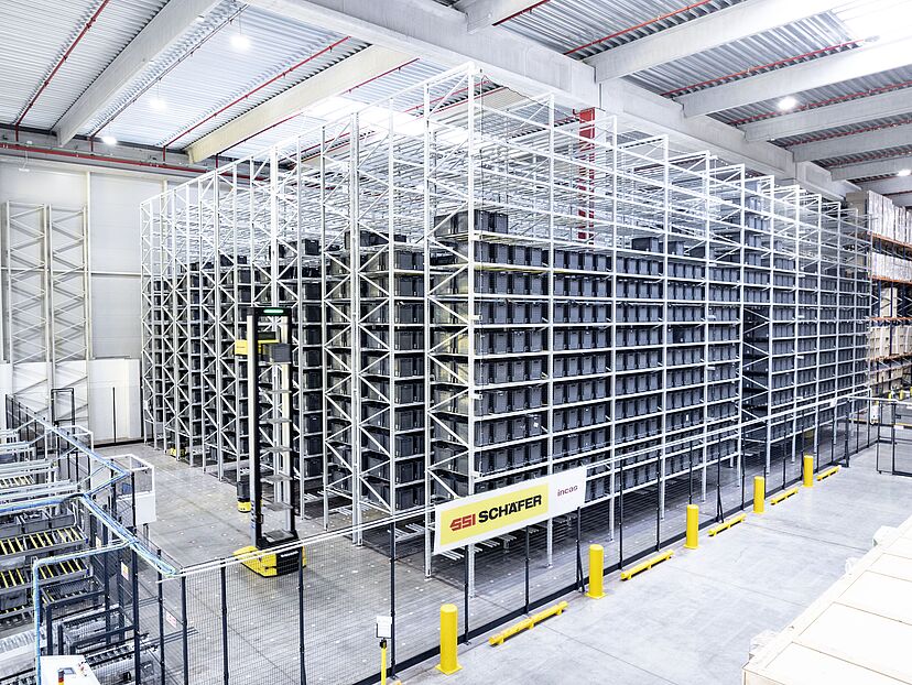 SSI Schäfer hat das durch einen Sicherheitszaun geschützte Kommissionierlager nahtlos in den Materialfluss der Halle eingebettet. Die Einlagerung ist über eine Fördertechnik angebunden, welche die Stückgüter in Behältern zu den Rack Bots leitet. Hinter einer Sicherheitsschleuse nehmen die Rack Bots die Behälter auf und fahren sie zu einem der 360 Pufferstellplätze. Dort wird die Ware von den Rack Bots übernommen und zu ihren Stellplätzen im Regallager gebracht.