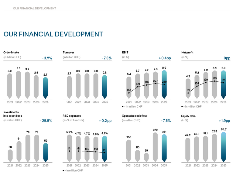 Dank eines breiten und innovativen Produktportfolios, einer globalen Präsenz und einer starken Lieferkette konnte Bühler in neue Märkte expandieren und seine Marktanteile in Schlüsselsegmenten ausbauen. In einem herausfordernden globalen Umfeld für Investitionsgüter blieb der Bestellungseingang in lokalen Währungen stabil. Infolge des tieferen Bestellungseingangs im Vorjahr ging der Umsatz zurück. Durch strikte Kostendisziplin und den Fokus auf interne Produktivitätssteigerungen konnte das Unternehmen seine EBIT-Marge auf 8.0 Prozent erhöhen (Vorjahr: 7.6 Prozent). Dies ermöglicht es Bühler, weiterhin in innovative Lösungen für seine Kunden zu investieren.