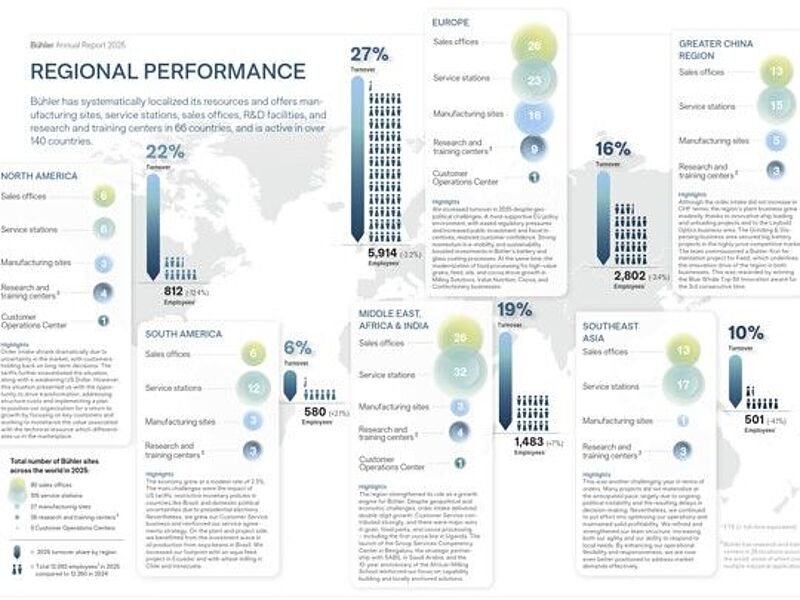 Die globale Präsenz und das Netzwerk von Bühler blieben stabil, mit ein paar regionalen Verschiebungen. In den USA gingen die Aufträge um 31 Prozent zurück, weil die Kunden wegen der Zollthematik verunsichert waren und ihre Investitionen in Anlagen und Lösungen zurückstellten. Das stärkste Umsatzwachstum kam aus Afrika, das zum ersten Mal die grösste Region für Bühlers Lebens- und Futtermittelgeschäft wurde. Die anhaltende Stärke der Region Naher Osten, Afrika und Indien mit besonders hohem Wachstum in Afrika und im Nahen Osten konnte die schwächere Entwicklung in Amerika und Asien teilweise ausgleichen.