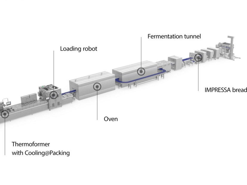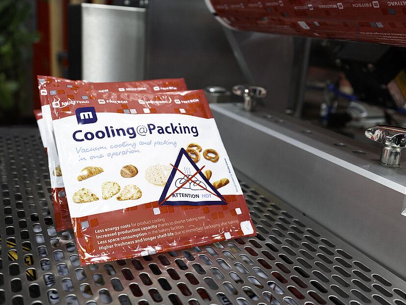 Durch den Einsatz von Cooling Packing lassen sich Backwaren, wie Baguettes, Brote oder Kekse, direkt aus dem Ofen hygienegerecht mittels Einlegerobotern in die offenen Packungen der Beladestation einer Tiefziehverpackungsmaschine einsetzen. In der Maschine werden sie durch das Vakuumieren der Kammern innerhalb weniger Sekunden von etwa 95 °C auf rund 30 °C heruntergekühlt. Das spart Platz in der Produktion, senkt den Energieverbrauch bei der Kühlung und steigert dank kürzerer Backzeiten die Produktionskapazität. Die neue Lösung lässt sich in Multivac Tiefziehverpackungsmaschinen für das Hochleistungssegment integrieren.